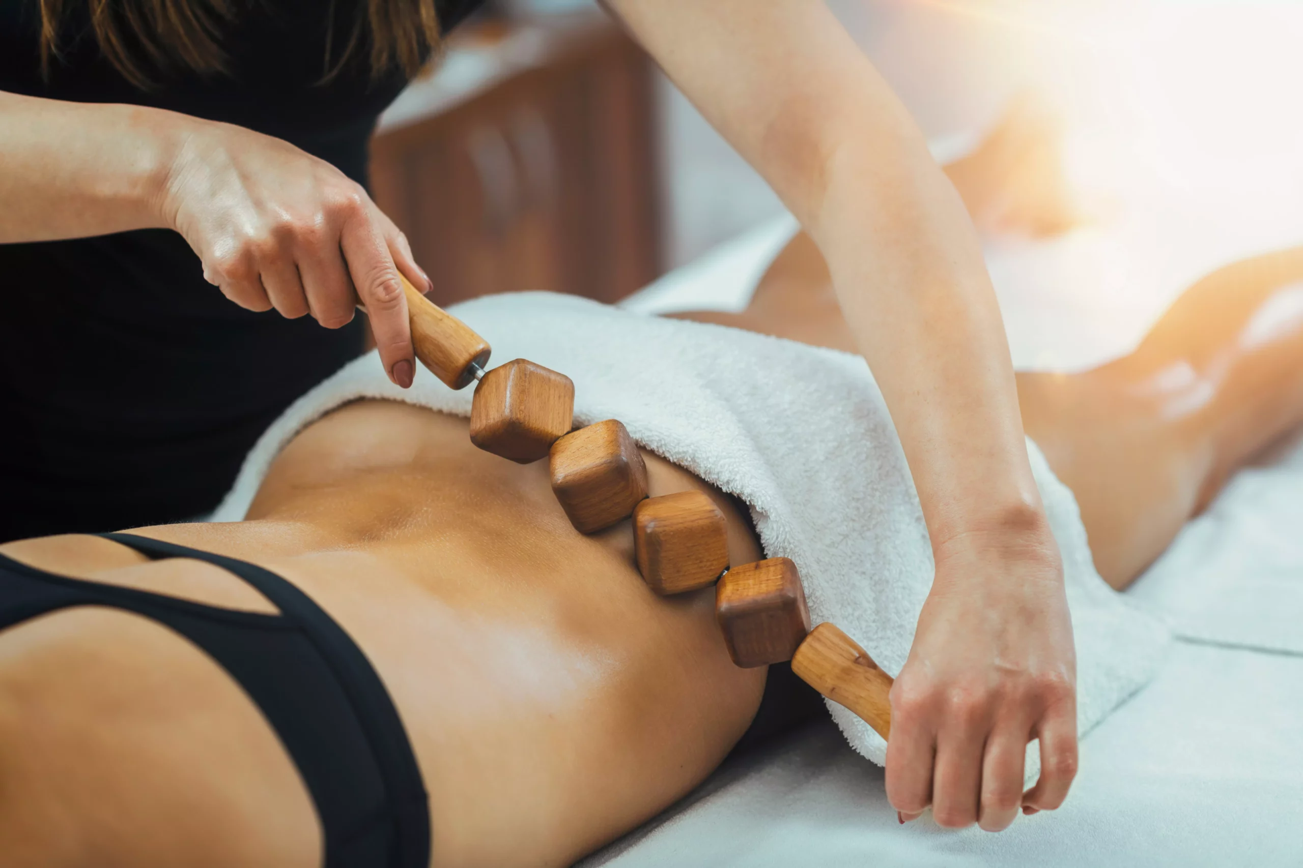 Die Behandlung nutzt spezielle Holzwerkzeuge, um Druck auf bestimmte Haut- und Gewebebereiche auszuüben. Dies fördert die Durchblutung, unterstützt die Fettreduktion und strafft das Gewebe.